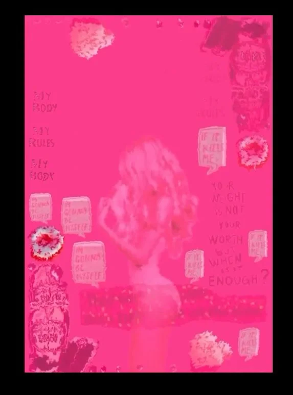 A digital collage image then turned into a short risograph filmed piece with Tv Girl’s song “Taking What’s Not Yours” Playing edited to the video. In this short, there is an issue with how women are to be pretty like if they smiled more, weighed less and that everyone hates them and their life is being taken away by whats not theirs at all.